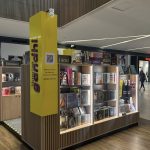 Se encuentra dentro, no en la cafetería, es dentro del edificio de la biblioteca, detras del elevador, muchas ediciones